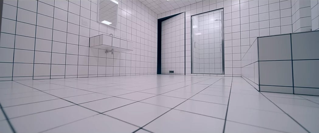 I think the primary factor that led to the deaths of Elisabeth, Sue, and their collective dream is the title of the movie: substance. Not the black market drug that destroyed them, but the lack of personality and soul that lies beneath their exterior. Every one of Elisabeth’s actions is a reaction to the way other people look at her. Her life is characterized by hopeless isolation as she has no friends or emotional support system. Her apartment is enveloped by huge glass windows that represent how she feels constantly exposed in the public eye; the only decorations in her living room are a giant self-portrait and a counter of small trophies, which show the shallowness of her self-perception; the white and sterile all-surrounding tiles of her bathroom where she undergoes the body switch are a prison that her mind is trapped in that is devoid of any color and life. When the other man asks her about her loneliness, it’s almost as if Elisabeth finally realizes the crux of all her suffering. That is why she goes home and calls Fred to go on a date. But she can’t do it, because she already feels like she’s losing her beauty and she knows that’s all she has to offer.